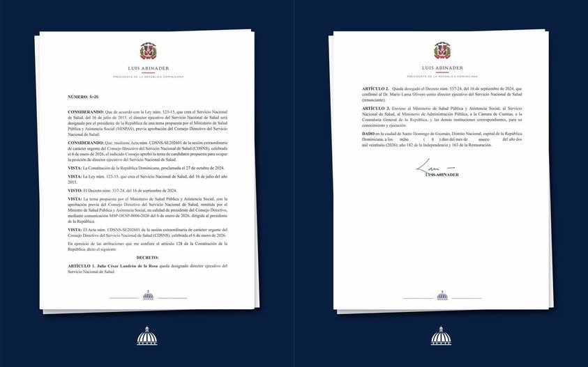 InfoSalud/ SANTO DOMINGO. – El presidente de la República, Luis Abinader, emitió este jueves el Decreto 6-26, mediante el cual designó al doctor Julio César Landrón de la Rosa como nuevo director ejecutivo del Servicio Nacional de Salud (SNS). La designación se produce tras la renuncia del doctor Mario Lama Olivero, quien lideró la institución en una etapa de transformación y récords en la prestación de servicios.