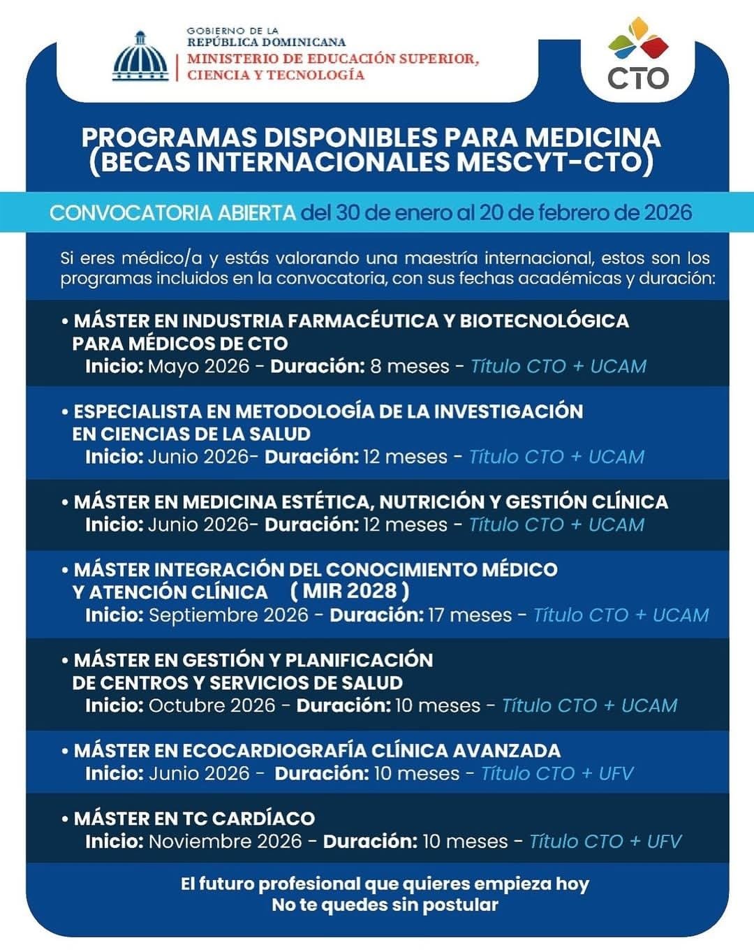 El programa busca fortalecer el sistema sanitario nacional mediante la formación de vanguardia en áreas críticas. Desde el 30 de enero y hasta el 20 de febrero de 2026, los médicos dominicanos podrán postularse para acceder a programas de maestría que combinan la experiencia académica de CTO con la acreditación de universidades internacionales.
